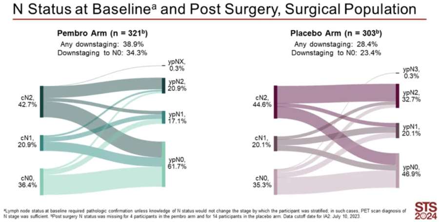 围术期免疫治疗与手术的相关性一直备受争论。今年2月,在第60届美国胸外科医师学会(STS)年会上,KEYNOTE-671研究公布了手术因素对患者临床结局影响,结果显示:与单纯新辅助化疗相比,术前新辅助帕博利珠单抗联合化疗不但不影响手术方式选择、不延长住院时间,还提高了淋巴结降期比例(38.9%vs 28.4%),尤其是改善淋巴结降期到N0的比例(34.3%vs 23.4%)(图3)[3]。随后在2024年ESTS年会上公布的数据进一步证实,无论淋巴结状态、基线疾病分期或手术类型,新辅助帕博利珠单抗联合化疗与单纯新辅助化疗相比,均能显著改善EFS[4]。