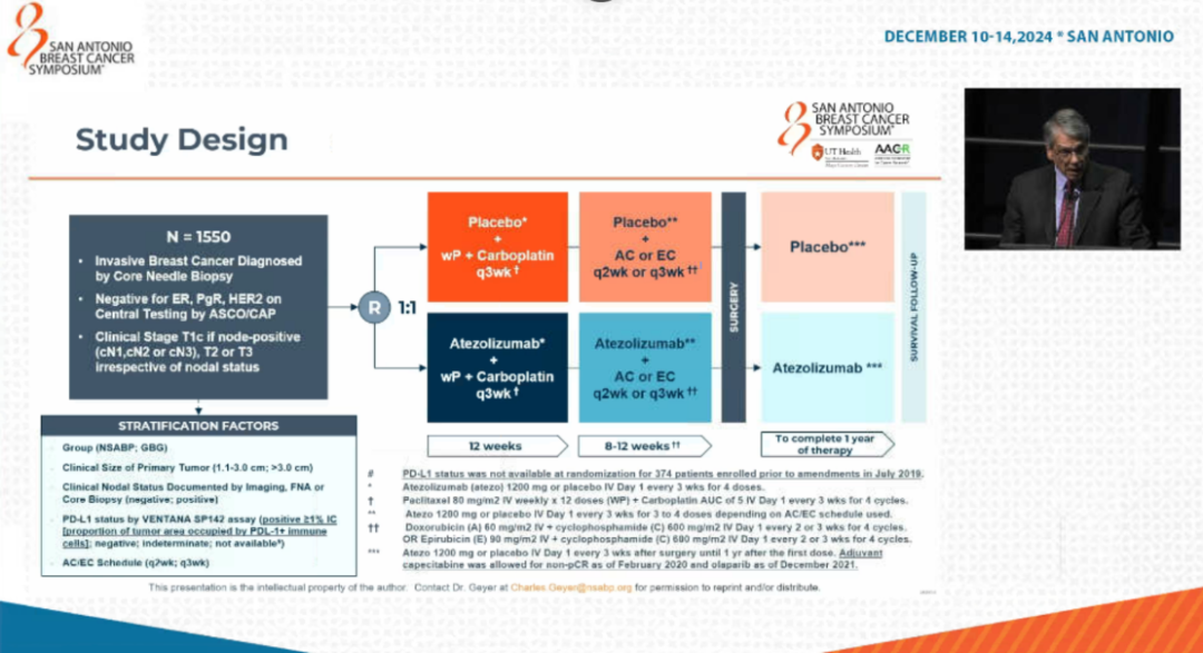 Charles E.Geyer,Jr.,et al.NSABP B-59/GBG-96-GeparDouze A randomized double-blind phase III clinical trial of neoadjuvant chemotherapy with atezolizumab or placebo followed by adjuvant atezolizumab or placebo in patients with Stage II and III triple-negative breast cancer.SABCS 2024 GS3-05.