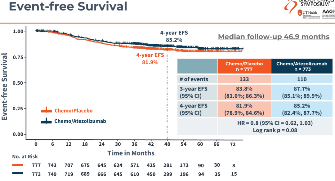 中位随访46.9个月后,阿替利珠单抗组与安慰剂组相比,主要研究终点:4年EFS率在ITT人群分别为85.2%与81.9%;HR 0.8(95%CI 0.62-1.03,P=0.08)。