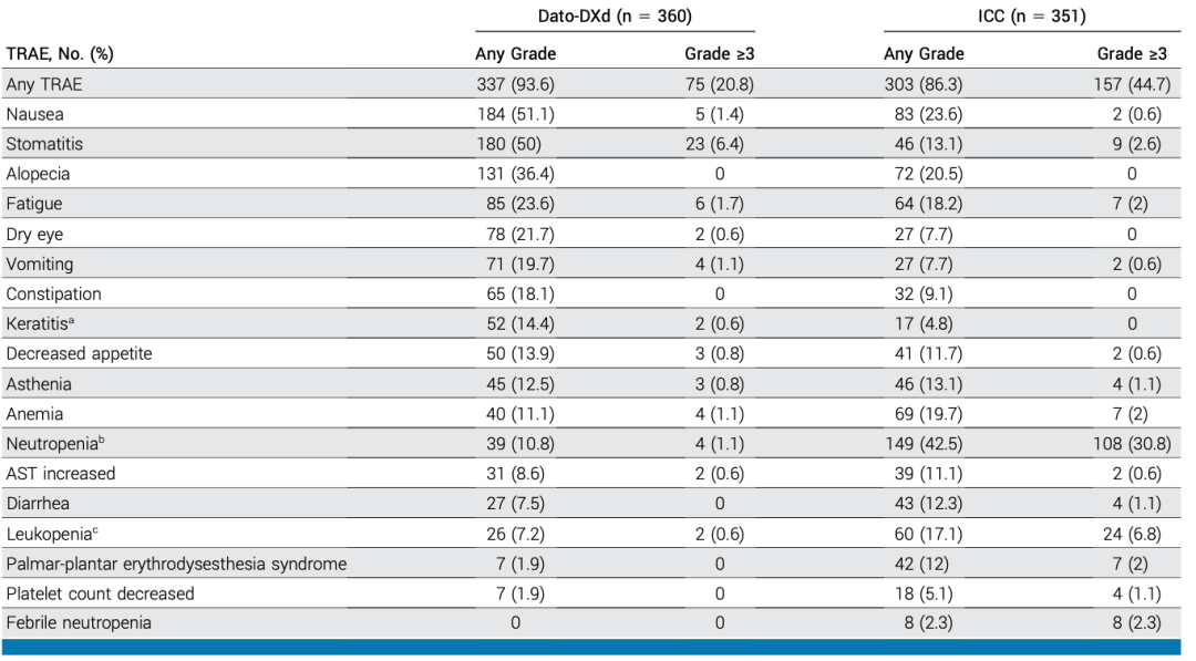 在次要终点方面,Dato-DXd也展现了较为出色的近期疗效和安全性,其客观缓解率(ORR)相较于化疗组提高了13.5%(36.4%vs 22.9%)。总体上,Dato-DXd组的任意级别治疗相关不良事件(TRAEs)发生率与化疗组相当,但Dato-DXd组的≥3级TRAEs发生率不到化疗组的一半(20.8%vs 44.7%),而且Dato-DXd组中大多数的≥3级TRAEs均为个案,发生率为1%左右。中性粒细胞减少症是几乎所有化疗乃至许多新型ADC中最为常见的不良事件之一,在TB-01研究中,化疗组≥3级中性粒细胞减少症发生率高达30.8%,而Dato-DXd组仅为1.1%,降低了将近30倍。Dato-DXd组相对常见的≥3级TRAEs是口腔黏膜炎,但发生率并不太高(6.4%),而且仅导致1例患者停药。Dato-DXd组整体的药物减量(20.8%vs 30.2%)和治疗中断(11.9%vs 24.5%)的患者比例也大幅低于化疗组。