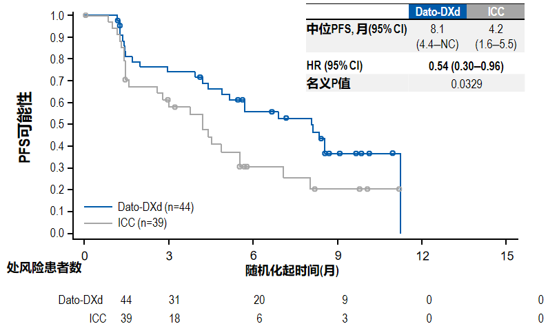 近日,2024年ESMO Asia大会上披露了TB-01中国队列的数据[5]。主要终点结果显示,BICR评估Dato-DXd组的中位PFS长达8.1个月,是化疗组的近2倍,疾病进展或死亡风险则显著降低46%(8.1 vs 4.2个月,HR 0.54,95%CI:0.30–0.96,名义P=0.0329)。
