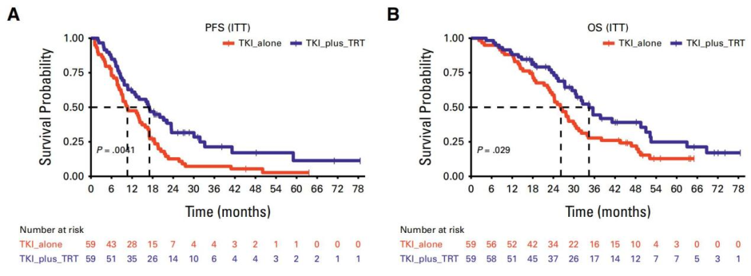 接受TKI单药治疗组,33.9%的患者出现局部进展,37.3%的患者首次进展部位为远处转移器官进展;而在联合治疗组,局部进展的比例仅为13.6%,50.8%的患者为远处转移器官进展。两组3度以上治疗相关不良反应发生率分别为11.9%和5.1%,其中,放射性食管炎、放射性肺炎以及严重骨髓移抑制发生率分别为6.8%、5.1%和3.4%。