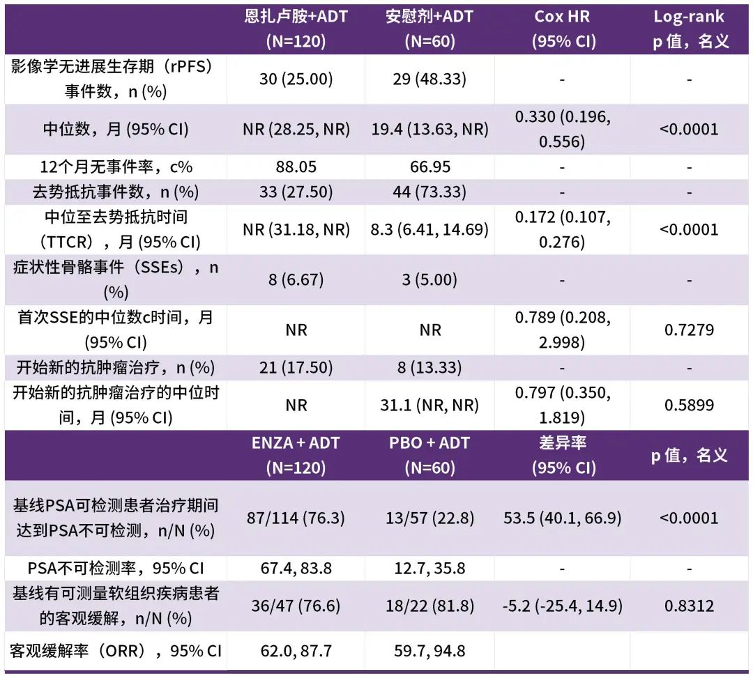 China ARCHES研究是一项针对初治mHSPC患者的III期临床研究。该研究将接受ADT联合恩扎卢胺治疗的患者试验组,而传统的单药ADT疗法作为对照组。研究结果显示在ADT联合恩扎卢胺能够显著延长疾病的控制时间,包括使PSA进展风险显著降低87%(HR 0.130,95%CI:0.076-0.222,P<0.0001),使影像学疾病进展或死亡风险显著降低67%(HR 0.330,95%CI:0.196-0.556,P<0.0001)等[5]。