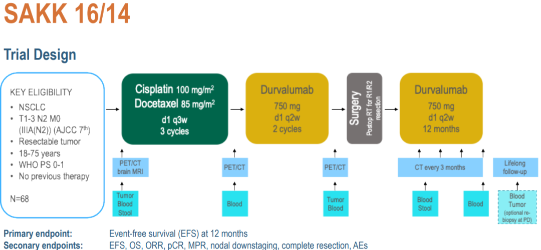 SAKK 16/14研究纳入68例可切除IIIA(N2)期非小细胞肺癌(NSCLC)患者,治疗方案为三个周期新辅助化疗(顺铂/多西他赛)序贯度伐利尤单抗。度伐利尤单抗术前治疗2周期,术后治疗12个月。