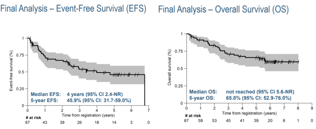 数据截止时,新辅助化疗+度伐利尤单抗围手术治疗的中位无事件生存期(EFS)为4.0年(95%置信区间[CI]:2.4年-NR),5年EFS率为45.9%(95%CI:31.7%-59.0%)。中位总生存期(OS)未达到,预计5年OS率为65.8%(95%CI:52.9%-76.0%)。