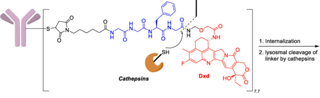 肽基连接子通过肿瘤细胞内高表达的蛋白酶(如组织蛋白酶B)实现选择性裂解。最常用的肽序列包括缬氨酸-瓜氨酸(Val-Cit)和苯丙氨酸-赖氨酸(Phe-Lys),其C端与自毁型(auto-immolative)间隔基如对氨基苄氧羰基(PABC)相连。这类连接子在血浆中非常稳定,因为血清蛋白酶抑制剂和中性pH环境抑制了蛋白酶的活性。典型的例子是Trastuzumab Deruxtecan(T-DXd),该ADC通过酶敏感的GGFG四肽连接子将抗HER2抗体与拓扑异构酶I抑制剂(DXd)相连(图2)[3]