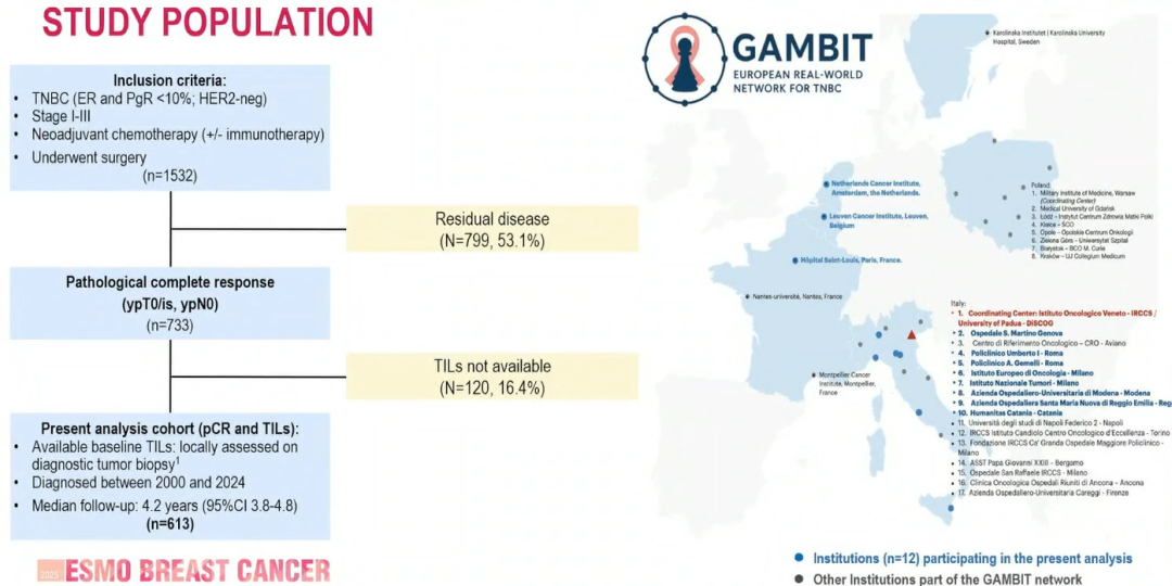 研究方法:这项回顾性研究纳入了2000年至2023年间在12个欧洲中心接受NAT治疗的I-III期TNBC患者(ER<10%,PgR<10%,HER2阴性)共1532例。其中,47.8%的患者达到了pCR。对治疗前活检标本中的TILs进行了评估,共有613例pCR患者的TILs数据可用(占pCR患者的83.6%),并构成了本次分析的研究队列。评估了无远处复发生存(DRFS)和总生存期(OS)。