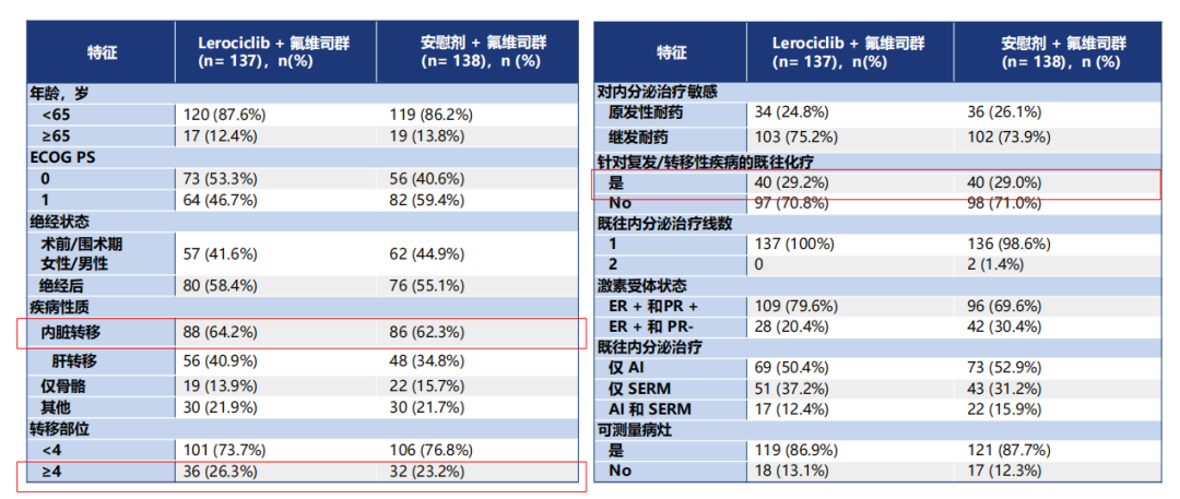 III期LEONARDA-1研究评估了来罗西利联合氟维司群在治疗内分泌耐药的HR+/HER2-晚期乳腺癌患者中的疗效和安全性。研究纳入了275例既往接受过一线或二线内分泌治疗进展的HR+/HER2-局部晚期或转移性乳腺癌患者,按1:1分配至来罗西利联合氟维司群组或安慰剂联合氟维司群组,主要研究终点是研究者评估的无进展生存期(PFS),次要研究终点是盲态独立中心(BICR)评估的PFS、总生存期(OS)、客观缓解率(ORR)、持续缓解时间(DoR)、疾病控制率(DCR)、临床获益率(CBR)、安全性和耐受性以及药代动力学等[1]