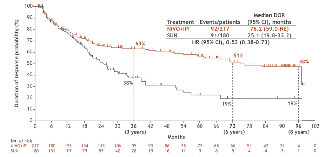 在ITT人群中,纳武利尤单抗/伊匹木单抗方案的中位缓解持续时间几乎是舒尼替尼方案的3倍(76.2个月vs 25.1个月)。