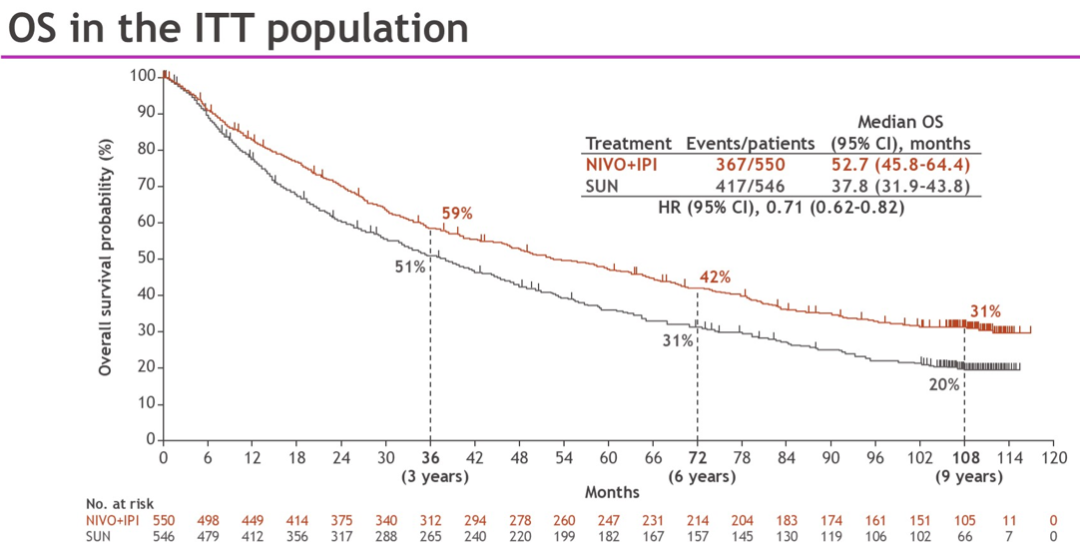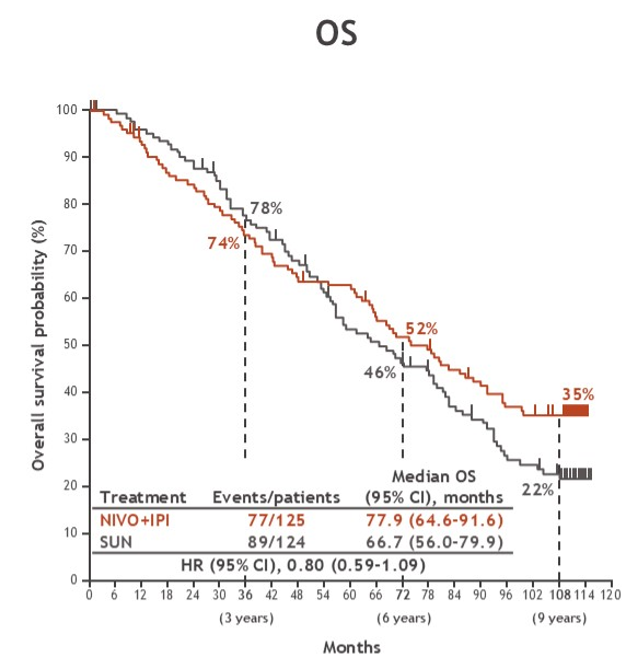 目前中位随访时间超过9年,在意向治疗(ITT)人群中,与舒尼替尼相比,纳武利尤单抗/伊匹木单抗治疗组患者的死亡风险降低了29%(HR 0.71);中危或高危患者死亡风险降低了31%(HR 0.69)。