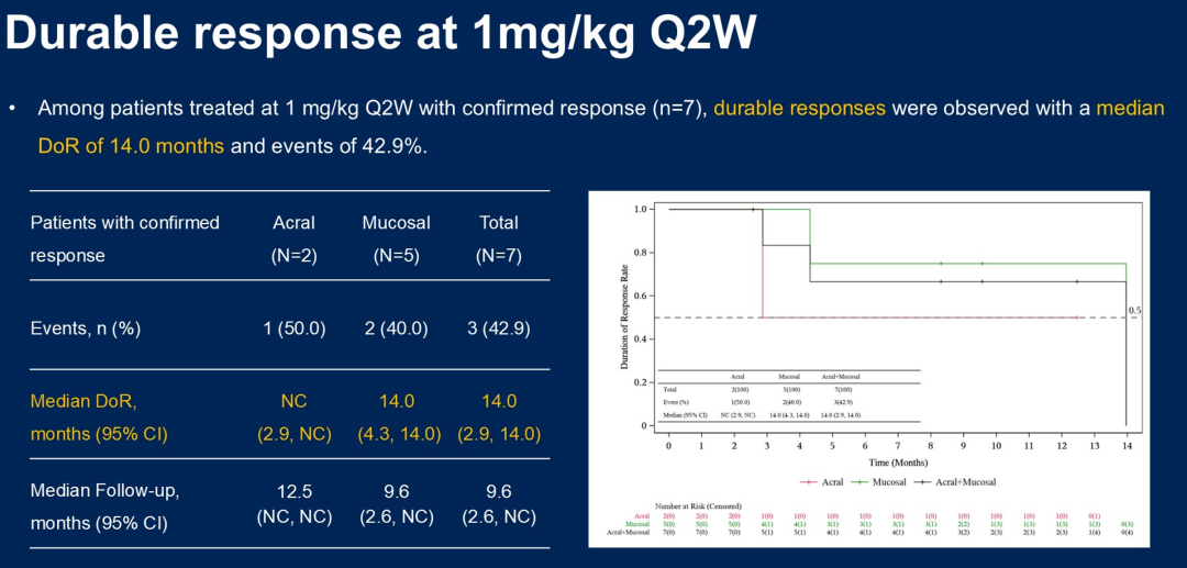 在87例可评估的晚期患者中,IBI363的客观缓解率(ORR)为24%。实际上,这一有效率数据对于肢端和黏膜黑色瘤患者而言是非常高的。从既往报道数据来看,无论是进口的PD-1还是国产的PD-1单药治疗,KEYNOTE-151、POLARIS-01等研究中单药免疫治疗的有效率未超过15%,无进展生存期(PFS)仅为2个月左右。
