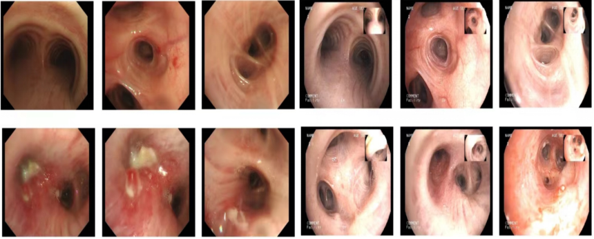 图4:由左至右分别展示基线(A1-3)及免疫化学治疗后改变(B4-6)。支气管开口肿瘤明显退缩,结合影像判断达PR。