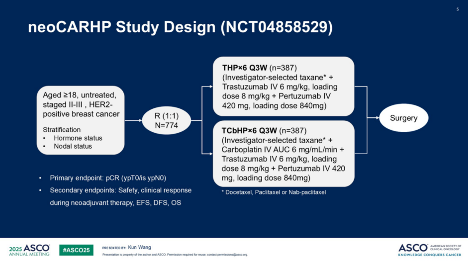广东省人民医院王坤教授在本次ASCO大会上报告的多中心、开放标签、随机、非劣效性的III期neoCARHP临床研究,进一步探讨了去化疗降阶梯新辅助治疗的可行性。研究纳入年龄≥18岁,未经治疗的II-III期浸润性HER2阳性乳腺癌患者。患者根据淋巴结和激素受体状态进行分层,并随机(1:1)接受6个3周周期的研究者选择的紫杉烷类(多西他赛、紫杉醇或白蛋白结合型紫杉醇)联合曲妥珠单抗(首剂8mg/kg,之后每3周6mg/kg)和帕妥珠单抗(首剂840mg,之后每3周420mg)治疗,同时随机分配接受卡铂(TCbHP组;AUC mg/mL/min)或不接受卡铂(THP组)治疗,旨在对比THP与TCbHP方案在HER2阳性早期乳腺癌新辅助治疗中的疗效与安全性。
