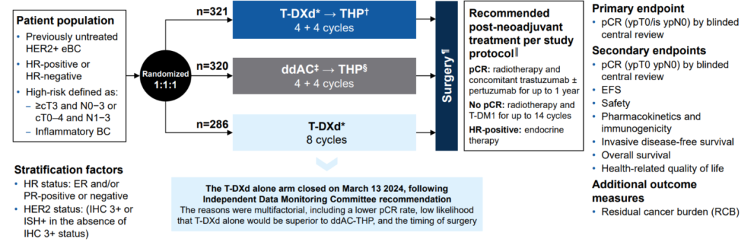 DESTINY-Breast11研究是一项全球、多中心、开放标签III期研究,旨在于高危HER2+早期乳腺癌患者中比较T-DXd单药、T-DXd-THP方案与标准ddAC-THP方案新辅助治疗的疗效。其高危标准包括:1)临床肿瘤分期≥cT3且淋巴结N0-3;2)cT0-4且N1-3;3)炎性乳腺癌。主要终点为病理完全缓解率(pCR,ypT0/Tis ypN0),次要终点包括无事件生存期(EFS)、安全性、药代动力学、免疫原性、总生存期(OS)、健康相关生活质量(HRQoL);额外结局指标为肿瘤残余负荷(RCB)。
