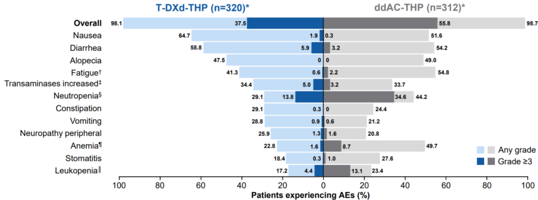 在安全性和耐受性方面,T-DXd-THP组较ddAC-THP组降低了≥3级不良事件(AE)发生率,为37.5%vs 55.8%;降低了一半的严重不良事件(SAE)发生率,为10.6%vs 20.2%;因AE导致的治疗中断发生率均有所下降。临床所关注的治疗相关间质性肺病(ILD)/肺炎发生率T-DXd-THP对比ddAC-THP组为4.4%vs 5.1%,左室心功能下降为1.9%vs 9.0%。对比ddAC-THP组,T-DXd-THP整体安全性和耐受性得以大幅提升。
