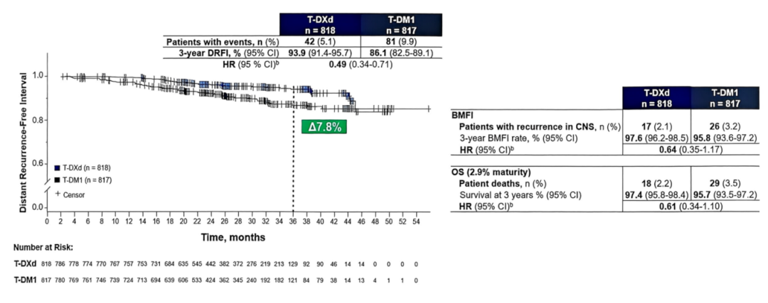 次要终点显示,相较于T-DM1,T-DXd将远处复发风险降低51%(3年DRFI率93.9%vs 86.1%,HR=0.49;95%CI:0.34–0.71),并将脑转移风险降低36%(3年BMFI率97.6%vs 95.8%,HR=0.64;95%CI:0.35–1.17)。