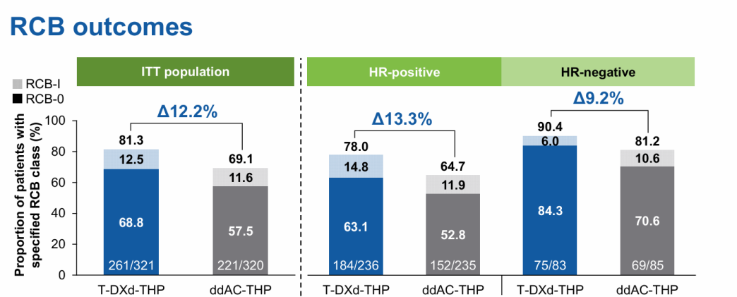 亚组分析显示:HR+/HER2+人群pCR率获得改善,为61.4%vs 52.3%;HR-/HER2+人群pCR率提升更为明显,为83.1%vs 67.1%。T-DXd-THP组较ddAC-THP组在RCB方面也得到了很好的改善,肿瘤残余更少,RCB-0/-I比例为81.3%vs 69.1%。由此可见,无论HR+、HR-人群均可从T-DXd-THP的治疗中获益,以HR-患者获益最为明显。