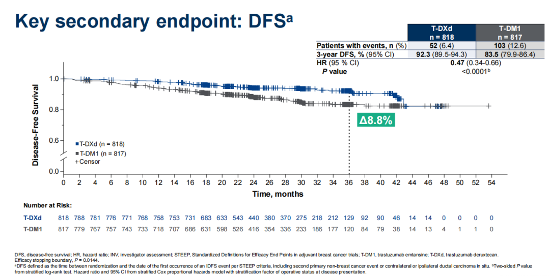 此外,关键次要终点3年DFS率提升8.8%(92.3%vs 83.5%;HR=0.47;95%CI:0.34-0.66;P<0.0001),3年DRFI率显著提升7.8%(93.9%vs 86.1%,HR=0.49),在降低脑转移发生风险方面,T-DXd组也呈现优势(3年BMFI:97.6%vs 95.8%HR=0.64)。虽然目前OS数据成熟度为2.9%,但从KM曲线上已经能看出T-DXd的获益趋势(HR=0.61)。