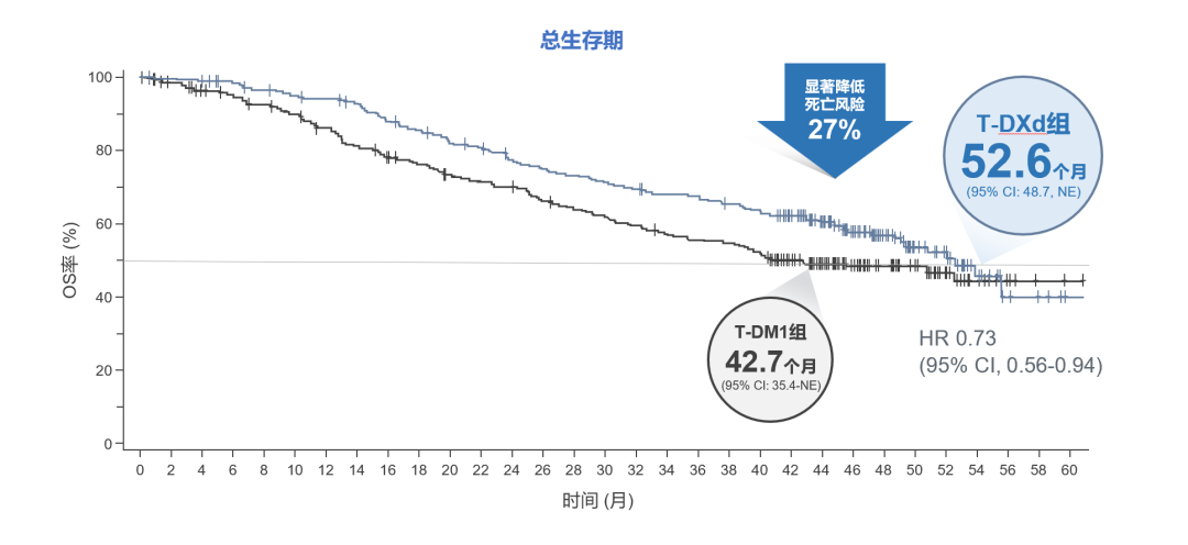 且在2021年ESMO年会首次公布期中分析结果后,DESTINY-Breast03研究结果又多次在重要国际学术会议和顶级期刊亮相,亮眼且夯实的数据给我们临床医生留下了非常深刻的印象,例如我们关注的晚期乳腺癌总生存期(OS)“金标准”,在T-DXd治疗组的中位OS达到52.6个月,而对照组为42.7个月,风险比(HR)值为0.73,95%置信区间为0.56-0.94,即T-DXd治疗使患者死亡风险显著下降27%,有明确OS获益。T-DXd能深度、长期地缩小肿瘤,且有明确OS获益的两方面证据,使更多临床工作者青睐T-DXd,且它进入医保后也被更多患者在二线治疗阶段使用,医生和患者都能更直观地感受到治疗获益,对ADC治疗更具信心,也有利于医患沟通,可以说“使用立刻就能起效的药,患者当然会觉得我是个好医生”。