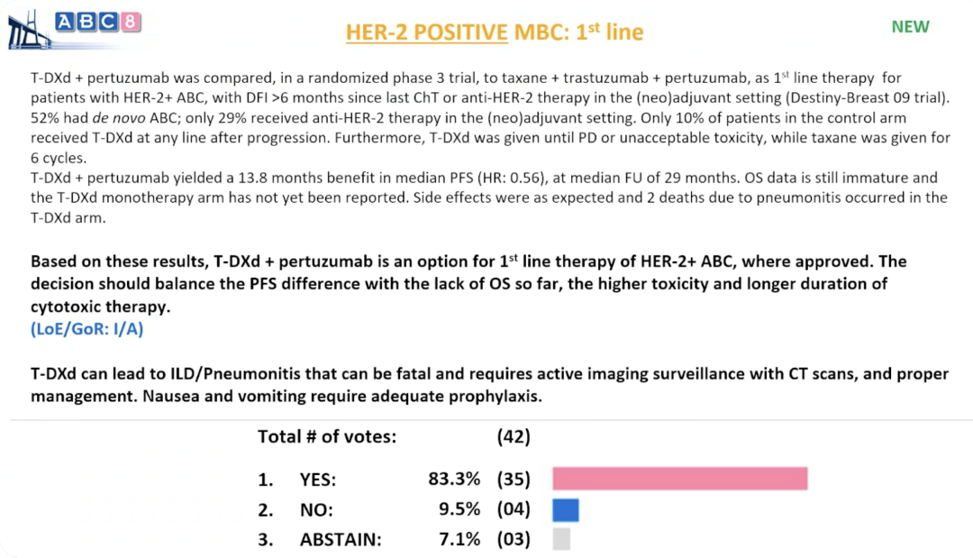 编者按:第8届晚期乳腺癌国际共识会议(ABC8)于当地时间2025年11月6~8日在葡萄牙里斯本举行。ABC共识指南是晚期乳腺癌领域首屈一指的国际性权威指南,汇聚了全球晚期乳腺癌领域的“意见领袖”级别专家,基于最新的循证医学证据对前沿和热议话题进行投票以达成共识,为全球晚期乳腺癌临床实践的革新和规范提供指导意见。肿瘤瞭望对HER2+晚期乳腺癌治疗相关问题的专家意见和投票结果整理如下。