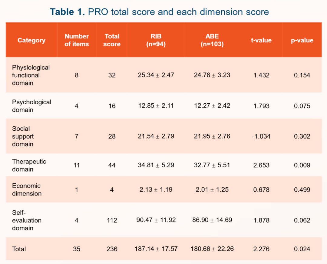 1.总体PRO得分:瑞波西利组总得分高于阿贝西利组(187.14±17.57 vs 180.66±22.26,P=0.024),显示瑞波西利组患者的整体生活质量更优。