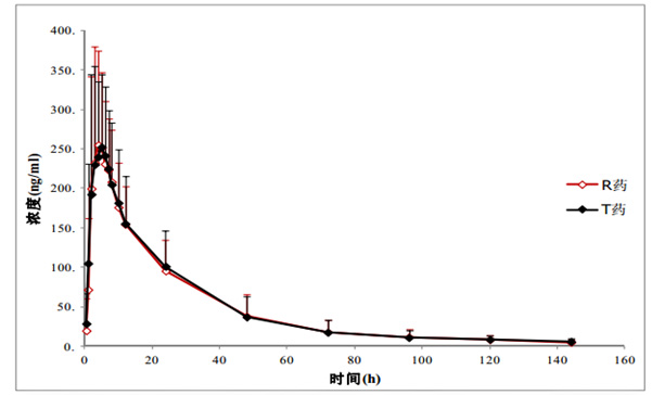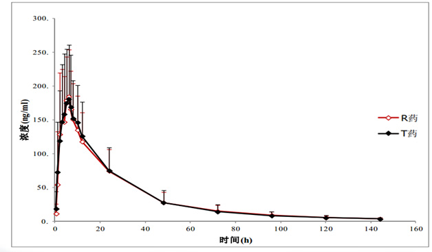 图2.空腹组受试者口服吉非替尼受试制剂(T)和参比制剂(R)的平均药时曲线