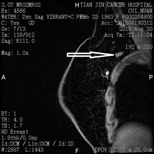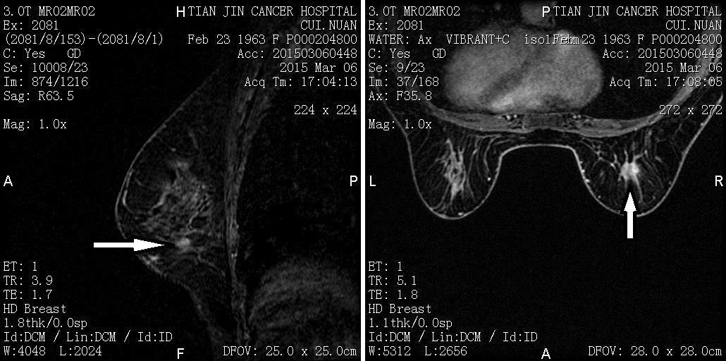 该例患者是典型的乳腺癌伴腋下、内乳区多发淋巴结转移病例,Ⅲc期,是新辅助治疗的适应症。对于术前的辅助检查,平扫加增强MRI可清楚地显示乳腺局部肿块和腋下、胸大小肌、内乳区的多发淋巴结转移病灶。该例乳腺癌分子分型为Luminal A型,考虑到患者较年轻,病灶淋巴结转移范围广,患者迫切要求缩短新辅助治疗时间,尽快手术,因而新辅助治疗选择标准的EC-T化疗方案。新辅助化疗期间乳腺局部病灶及转移淋巴结持续缩小,至单药多西紫杉醇期间原病灶部位及腋下查体均为阴性,遵循指南和共识的治疗规范,共8个周期的新辅助化疗顺利完成后复查乳腺MRI:原发乳腺病灶显示不清,内乳区及腋窝淋巴结明显缩小。由乳腺外科及胸外科医生联合讨论会诊,决定行右乳癌保乳术 + 腋窝淋巴结清扫术 + 内乳区淋巴结清扫术,术后病理显示为pCR。术后继续完善辅助放疗,序贯辅助内分泌治疗至今。