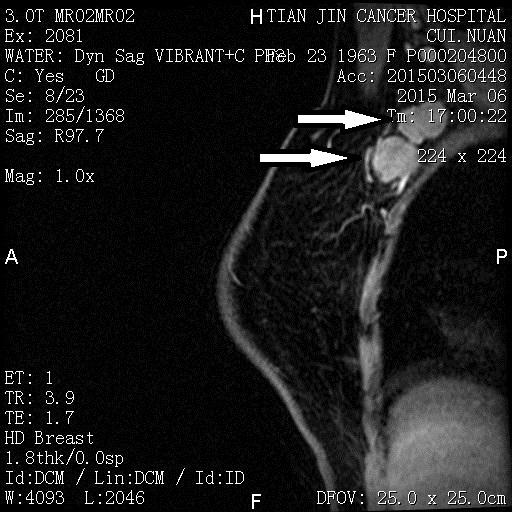 患者女性,52岁,未绝经,公司职员,主因“门诊发现右乳肿物伴右腋下多发肿大淋巴结1周”入院。
