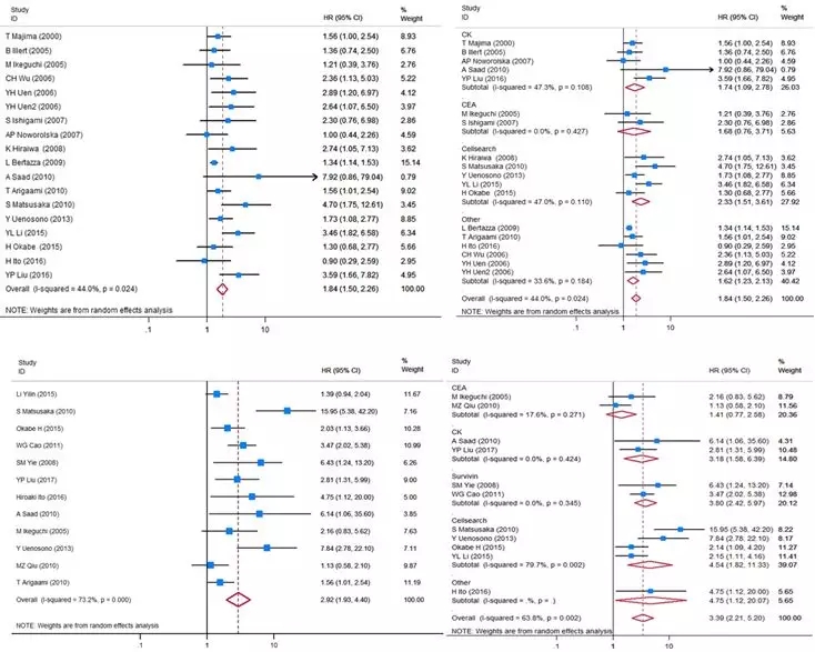 本研究团队通过对现有证据的综合,制定了严格的纳入排除标准,最大程度上消除了偏倚,进行了一项大型系统评价,累积纳入分析了3814名不同临床分期的胃癌患者,结果发现不论是早期还是晚期胃癌,在手术前或手术后检测出循环肿瘤细胞或者循环肿瘤核酸,对患者都有较强的预后不良的提示作用。本研究以最高证据级别,首次肯定了“液体活检”对胃癌的预后提示作用,验证了Cellsearch,细胞角蛋白等作为检测靶点更为可靠(图2);同时发现循环肿瘤核酸需要根据其生物学作用来判断其是作为预后不良还是较好的靶点。