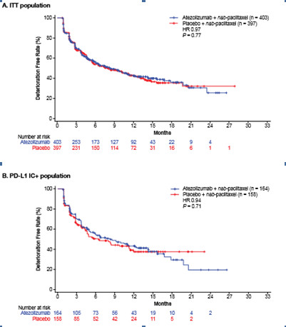 试验组阿替利珠单抗联合白蛋白紫杉醇和对照组白蛋白紫杉醇单药,这两组间患者评估的HRQoL至恶化时间(TTD)没有差异, ITT人群(HR=0.97; 95% CI: 0.80, 1.18),PD-L1 IC+ 人(HR, 0.94; 95% CI: 0.69, 1.28)。两组的 HRQoL从基线到研究结束保持稳定,没有明显改变,HRQoL没有临床显著恶化发生(从基线平均分数下降≥10点)。