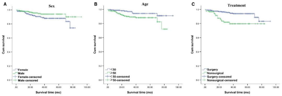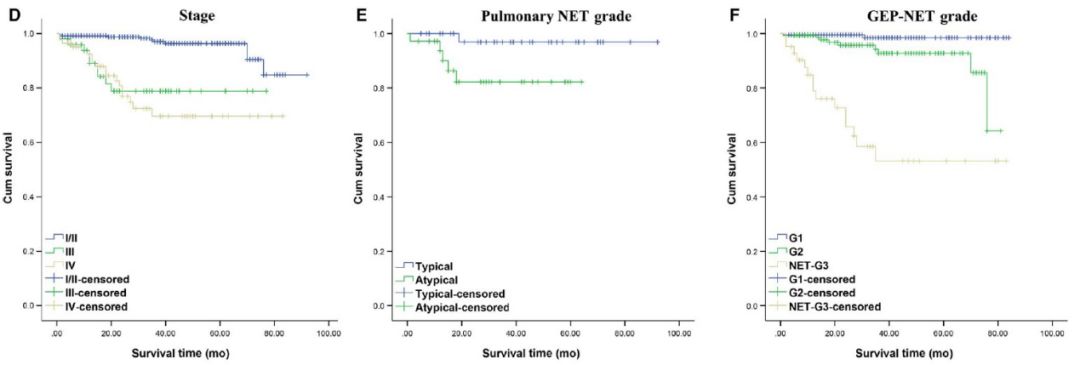 结果:547例患者年龄范围较广(9-87岁),男女比例为1:1.1。肿瘤原发部位方面:413例位于消化系统,74例位于肺部,15例位于纵隔,8例原发部位不明,37例位于其他部位。在413例消化系统NETs患者中,胰腺、直肠和胃是最常见的原发部位。84例患者在首次确诊时已发生血行转移,其中,肝、骨、肺是最常见的转移部位。82例患者在首次确诊时已发生淋巴结转移。手术和化疗是临床常用的治疗手段。统计分析显示,年龄<50岁、女性、低级别肿瘤、无远处转移、肠道NET和行手术治疗的患者预后较好。