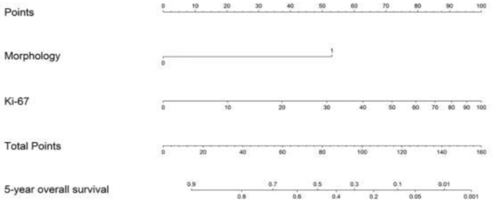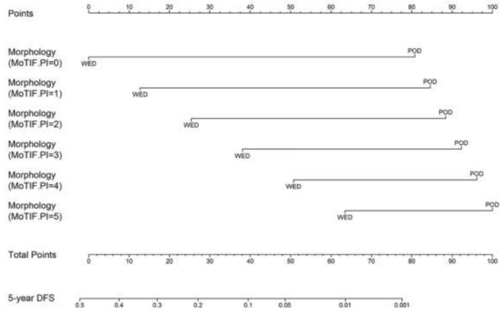 结果: G1/G2级和G3级GEP-NENs存在免疫炎症标志物的表型差异。根据HLA、CD3、CD8和PD-1/PD-L1 IHC表达,可将G3级分成两个亚组,分别具有高或低获得性免疫相关特征。用于OS评估的MoTIFs PIs基于COX-2 Tumor(T)> 4,PD-1 Stromal(S)> 0,CD8S <1和HLA-IS <1,该指数与较差的OS相关[风险比(HR)2.50;95%置信区间(CI),2.12-2.96;P <0.0001]。用于DFS评估的MoTIFs PI基于COX-2T> 4,PD-1S> 4,HLA-IS <1,HLA-IT <2,HLA-DRS <6 (HR 1.77; 95%CI,1.58-1.99; P<0.0001)。在分化良好的GEP-NENs中,该研究构建了两个列线图,分别用于OS评估【包括形态学(HR 4.83; 95%CI,2.30-10.15;P<0.001)和Ki-67指数(HR 11.32;95%CI,5.28-24.24;P<0.001)】及DFS评估【包括形态学(PI=0:HR 10.23;95%CI,5.67-18.47;PI=5:HR 2.87;95%CI,1.21-6.81;P<0.001)和MoTIFs PI(HR 6.21;95%CI,2.52-13.31;P<0.001)】。