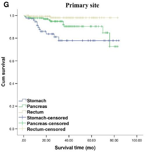 国外流行病学资料显示,欧美NETs多发于小肠、直肠、胰腺[1.2]。国内小肠发病罕见,多发生于胰腺、直肠、胃。这可能与人种、地域及饮食差异有关。依荷芭丽·迟等[3]分析了中国医学科学院肿瘤医院252例NENs(不包括肺小细胞癌),排在前4位的是肺(29.4%)、直肠(23.0%)、胃(10.7%)、阑尾(3.2%)。邱旭东等[4]分析了卫生部中日友好医院903例NENs(不包括肺小细胞癌),排在前4位的是胃(22.9%)、直肠(22.3%)、胰腺(20.5%)、肺、胸腺或纵膈(9.6%)。我院547例NETs患者数据,GEP-NETs患者392例(71.7%)、肺74例(13.5%)、GEP-NETs中排在前4位的依次是胰腺141例(25.8%)、直肠136例(24.9%)、胃81例(14.8%)、十二指肠19例(3.5%)。由此可见国内不同中心常见的发病部位存在差异。原发部位不同,疾病预后也不同。我们随访分析发现直肠原发患者的1、3、5年生存率均高于胰腺原发患者,胰腺原发患者均高于胃原发患者,差异有统计学意义。本中心直肠NETs中G1的占比明显高于胰腺和胃,而胃NETs中NET-G3的占比明显高于直肠和胰腺。而G1的预后明显优于G2及NET-G3。直肠NETs的预后优于胰腺NETs及胃NETs,可能与分级占比有关。总体来说,NETs的预后较好,关于NETs的治疗,相关的循证医学证据仍然较少。手术是NETs首选治疗方式,非手术治疗主要包括SSAs,靶向治疗,化学疗法和PRRT等。