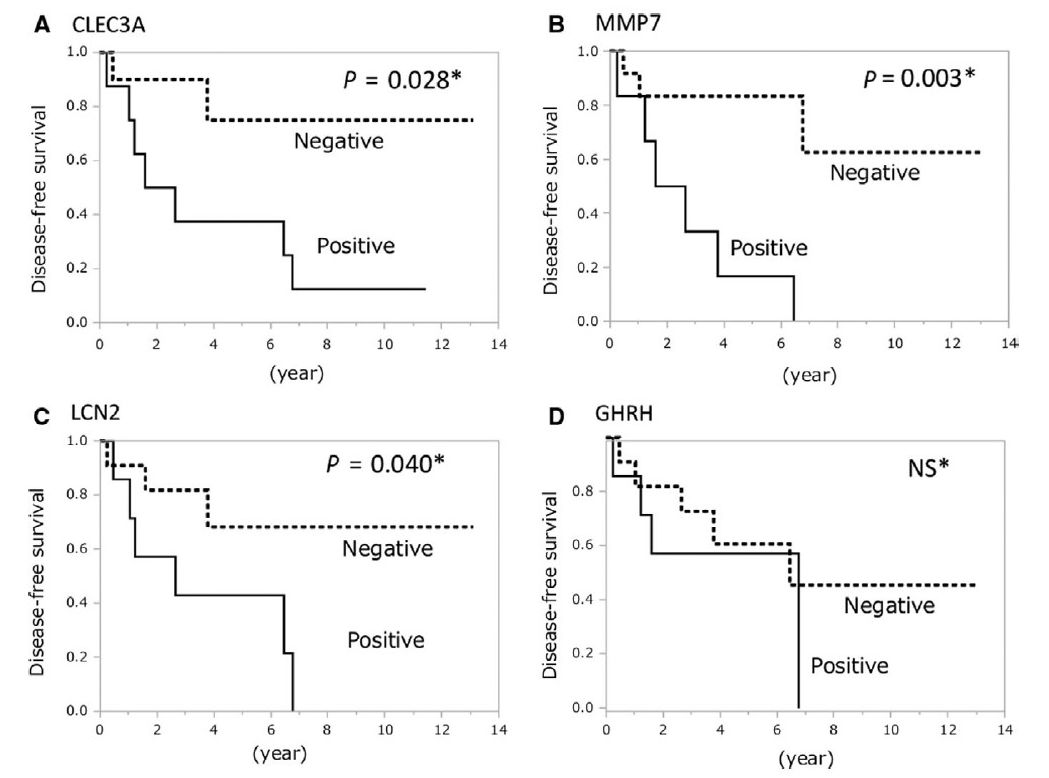 结果:CLEC3A(P=0.028)、MMP7(P=0.003)和LCN2(P=0.040)阳性表达患者的复发率显著高于阴性表达患者。