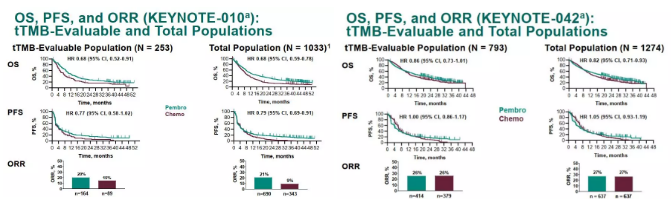 在KEYNOTE-010研究、KEYNOTE-042研究中,分别有254例、793例患者具有足够的组织DNA,并成功进行WES以评估TMB,共计253例、793例患者纳入tTMB可评估人群。