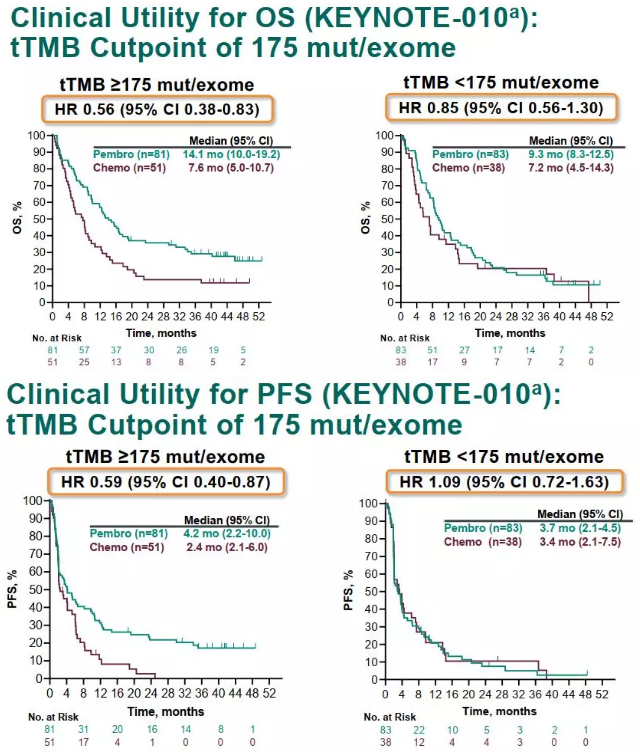 KEYNOTE-010研究中,在tTMB≥175 mut/exome的患者中,帕博利珠单抗组的中位OS为14.1个月,化疗组的中位OS为7.6个月(HR=0.56;95%CI: 0.38~0.83)。两组中位PFS分别为4.2个月和2.4个月(HR=0.59;95%CI: 0.40~0.87);两组ORR分别为23.5%和9.8%。在tTMB<175 mut/exome的患者中,博利珠单抗组和化疗组的中位OS分别为9.3个月和7.2个月(HR=0.85;95%CI: 0.56~1.30),中位PFS分别为3.7个月和3.4个月(HR=1.09;95%CI: 0.72~1.63);ORR分别为16.9%和21.1%。