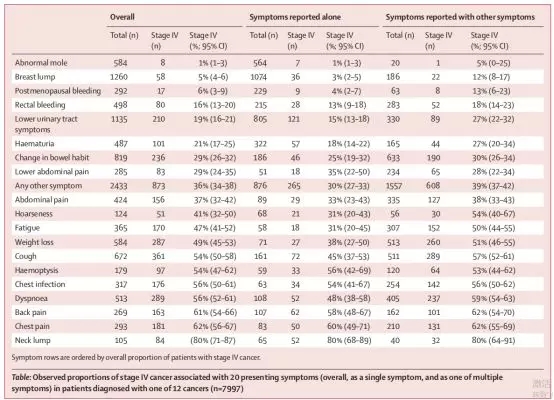 结果显示,最常见的症状是乳房肿块(15.8%),最少见的症状是颈部肿块(1.3%)。34%的患者报告有两种或两种以上的症状。诊断为Ⅳ期肿瘤的患者比例和有异常痣的患者比例一样低(1%),而有颈部肿块的晚期癌症患者的比例高达80%。就13个症状(痣异常、乳房肿块、绝经后出血、直肠出血、下尿路症状、血尿、排便习惯改变、声音嘶哑、疲劳、腹痛、下腹部疼痛、体重减轻或“任何其他症状”)而言,超过一半的患者被诊断为非晚期癌症。