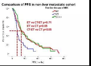 约70%的患者处于绝经后状态(ET:76.6%,CT:75.5%,CT-ET:68.9%)。在绝经后人群中,内分泌组(15.1个月,95%CI:10.6~19.7)及化疗序贯内分泌组(13.6个月,95%CI:9.3~17.8)的中位PFS显著优于化疗组(8.0个月,95%CI:7.0~9.0)。但在绝经前人群中,化疗序贯内分泌组的中位PFS(16.6个月,95%CI:9.9~23.3)显著优于内分泌组(10.1个月,95%CI:6.3~13.9)及化疗组(9.1个月,95%CI:6.3~12.0)。