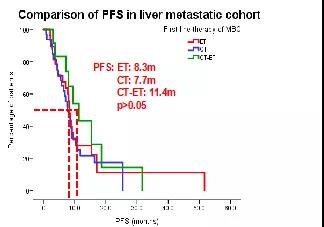 在肺转移人群中,内分泌组(13.1个月,95%CI:5.1~21.1)和化疗序贯内分泌组(15.4个月,95%CI:9.2~21.6)的中位PFS显著优于化疗组(6.9个月,95%CI:6.1~7.7)。在非肺转移组内,内分泌组和化疗序贯内分泌组的中位PFS同样优于化疗组,分别为:14.4个月(95%CI:10.1~18.6),13.7个月(95%CI:10.3~17.1)及8.7个月(95%CI:6.8~10.6)。