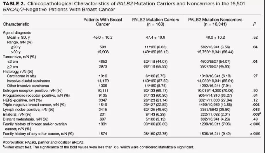 与PALB2突变密切相关的临床特征包括:乳腺癌或卵巢癌家族史(P<0.0001),肿瘤≥2厘米(P=0.04),三阴性乳腺癌(P=0.004),淋巴结阳性(P=0.018),双侧乳腺癌(P=0.003)。