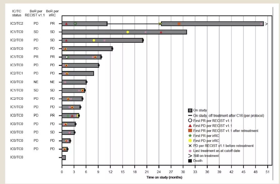 这项研究共纳入17例复发难治性广泛期SCLC患者,Atezolizumab的治疗剂量为15 mg/kg或1200 mg,每3周治疗一次直至16周期或患者不再有临床获益。主要研究终点为安全性,次要研究终点为药物的疗效。