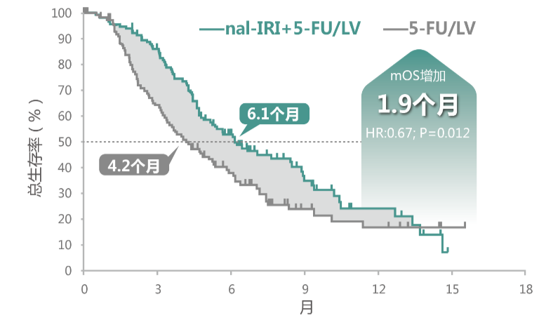2015年发表于《柳叶刀》的NAPOLI-1研究结果显示,在主要终点方面:nal-IRI+5-FU/LV组患者的OS为6.1个月,相较于5-FU/LV组的4.2个月延长了1.9个月(HR 0.67,95%CI:0.49~0.92,P=0.012)[4](见下图)。