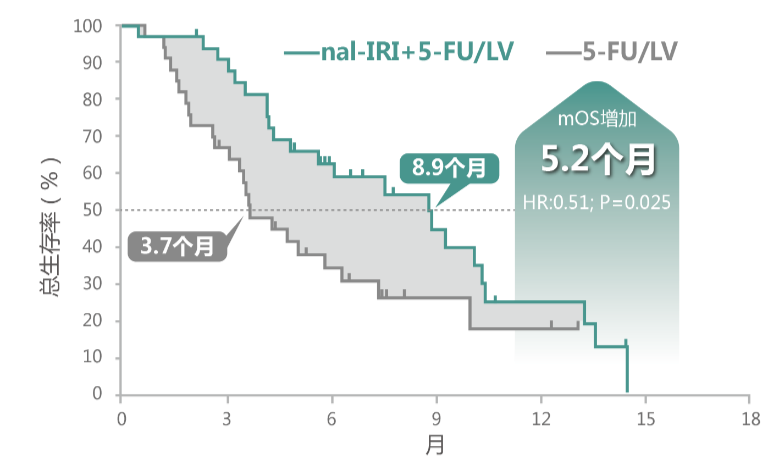 王理伟教授:NAPOLI-1研究中入组了来自13个亚洲中心(韩国5个,中国台湾8个)的132例亚裔患者,约占整体人群的32%。相较于5-FU/LV组,nal-IRI+5-FU/LV组患者的中位OS从3.7个月延长到了8.9个月(HR 0.51,95%CI:0.28~0.93,P=0.025)(见下图),中位PFS从1.4个月延长到了4.0个月(HR 0.48,95%CI:0.27~0.85,P=0.011);ORR从0%提高至8.8%;CA199应答率从7.7%提高至32.0%(P<0.001)[6]。