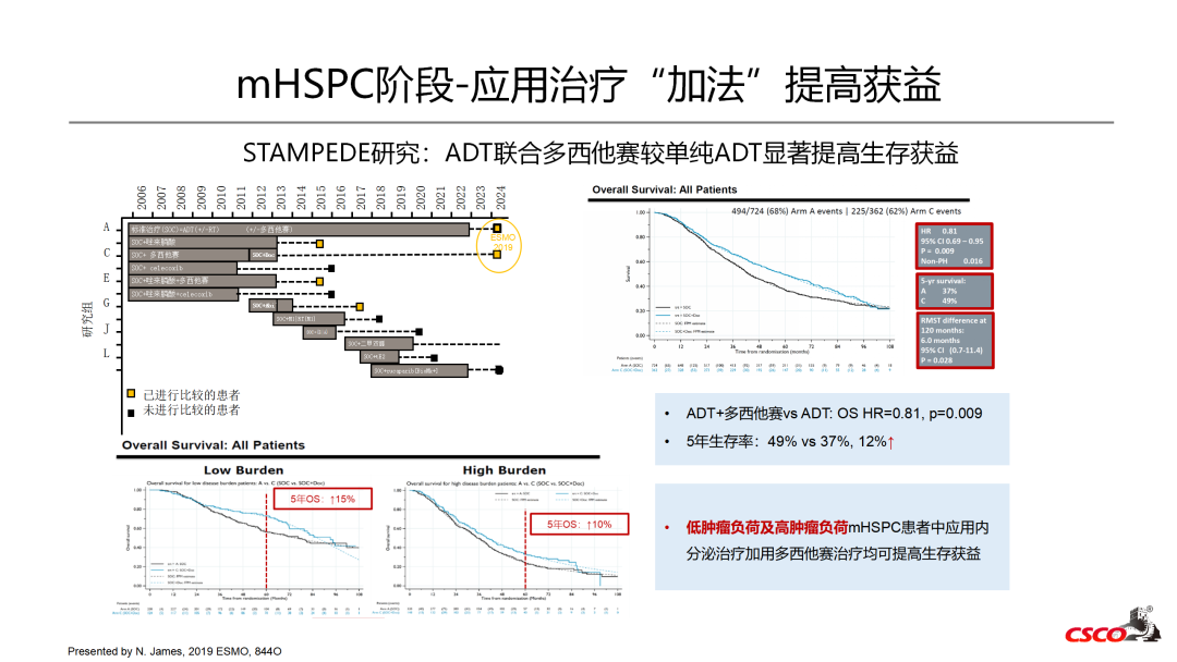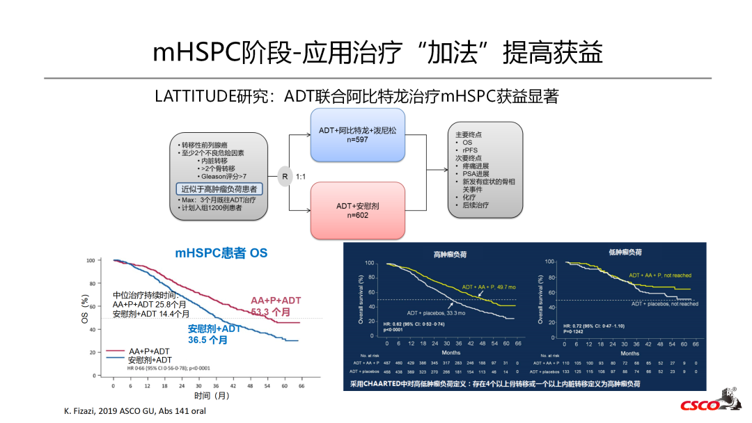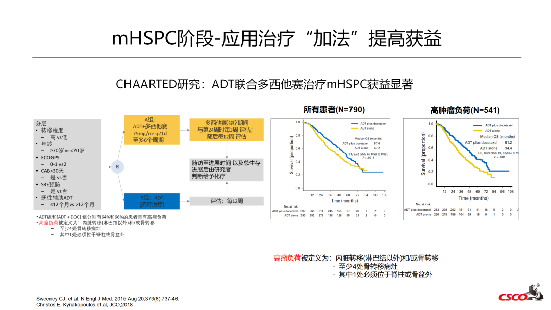 对于mHSPC患者,采用“加法”可以提高获益。CHAARTED研究显示,对于内脏转移和/或骨转移(至少4处骨转移,且1处于脊柱骨盆外)的高瘤负荷mHSPC患者,在雄性激素剥夺治疗(ADT)基础上联合多西他赛较单独ADT治疗可以显著改善生存,mOS 51.2个月 vs 34.4个月。而低瘤负荷则无显著改善。