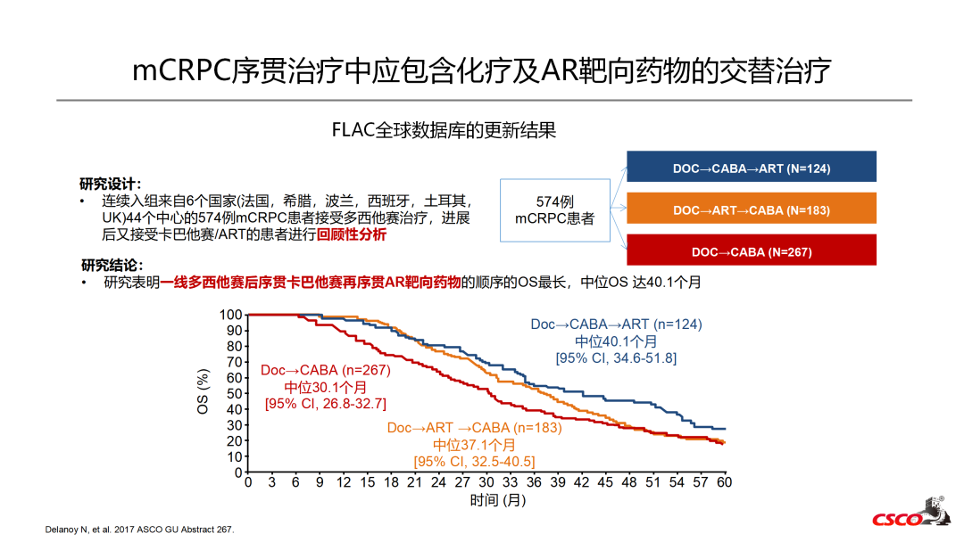 面对mCRPC,现下有多西他赛、卡巴他赛等化疗药物,也有阿比特龙、恩扎卢胺等新型内分泌药物(ART),其用药线序应如何选择?对于ART,过去的一系列研究均显示,恩扎卢胺和阿比特龙存在交叉耐药,所以在序贯治疗中应包含化疗和ART的交替使用。2017年ASCO会议中对FLAC全球数据库的44个中心574例mCRPC患者进行了回顾性分析,对多西他赛、卡巴他赛、ART用药线序探索显示,似乎一线多西他赛后序贯卡巴他赛再序贯ART的线序最佳,能为患者带来最长mOS,达到40.1个月。