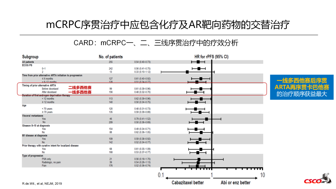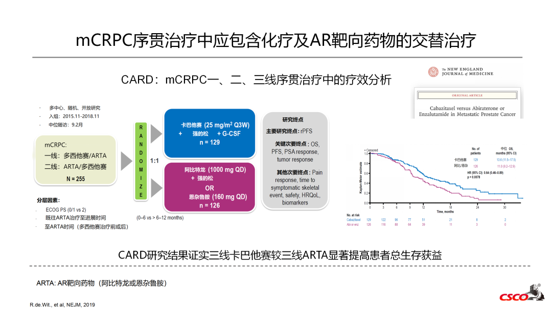 CARD的研究同样对mCRPC一、二、三线序贯治疗进行探索,对于一二线使用过多西他赛和ART的患者,三线使用卡巴他赛较ART能带来更好的生存获益,mOS 13.6个月vs 11.0个月。亚组分析则显示,一线多西他赛、二线ART较一线ART、二线多西他赛效果更优,所以可能一线多西他赛后序贯ART在序贯卡巴他赛能取得较好的结果。但最终的排兵布阵仍无定论,需要更多的研究。