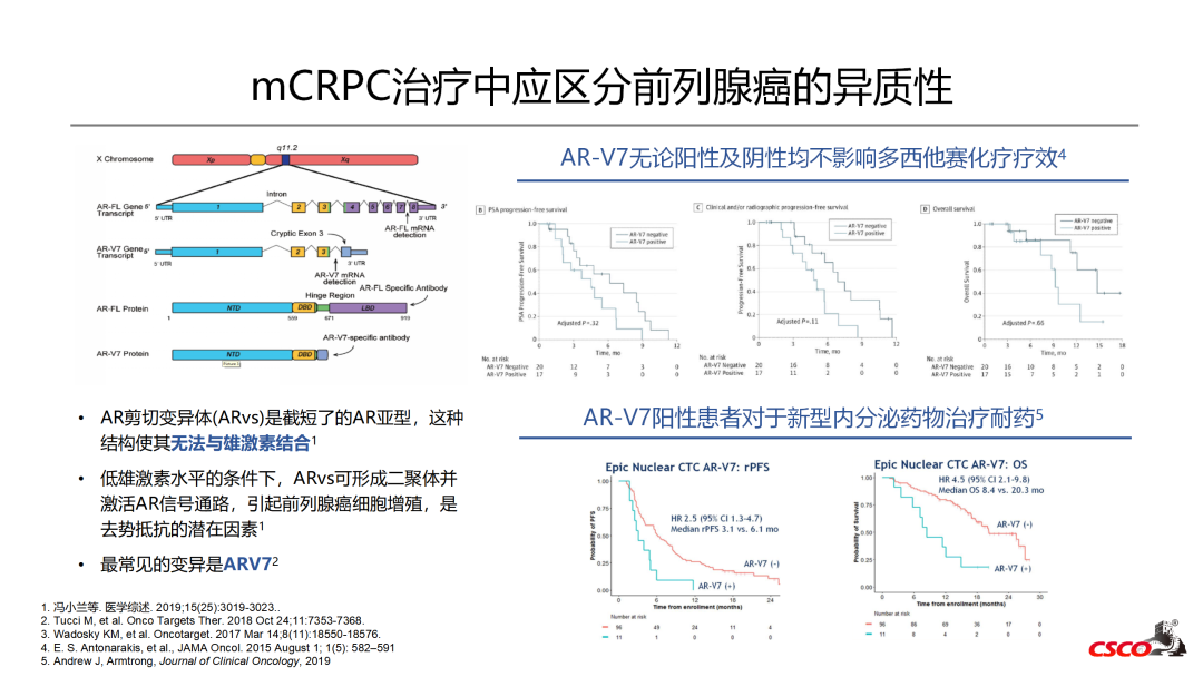 再者,经过内分泌治疗可以诱导产生神经内分泌化前列腺癌,临床中也存在部分原发性,此类患者细胞表面AR表达显著减少,ART治疗效果不佳,应优先考虑多西他赛或卡巴他赛化疗。此外,部分mCRPC患者存在AR剪切变异体,该结构无法与雄性激素结合,对ART治疗无反应,其中最常见的变异ARV7。有研究显示,ARV7无论阳性或阴性菌不形象多西他赛化疗疗效,但ARV7阳性患者则对ART治疗耐药。