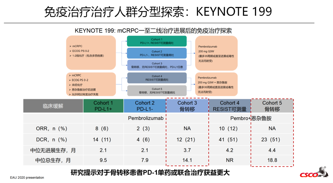 KEYNOTE 199则对不同类型的mCRPC患者使用免疫治疗进行了探索。入组的患者分为5个队列:队列1为1-2线化疗失败后PD-L1阳性患者;队列2为1-2线化疗失败后PD-L1阴性患者;队列3为1-2线化疗失败后骨转移患者,PD-L1不限;队列4为ART治疗失败后存在可测量病灶患者;队列5为ART治疗失败后骨转移患者。对队列1-3使用帕博利珠单抗,4-5使用帕博利珠单抗+恩扎卢胺,结果显示队列3、5含有骨转移患者疗效较好,mOS分别为14.1个月和18.8个月,而患者PD-L1阳性与否与疗效似乎并无关系。