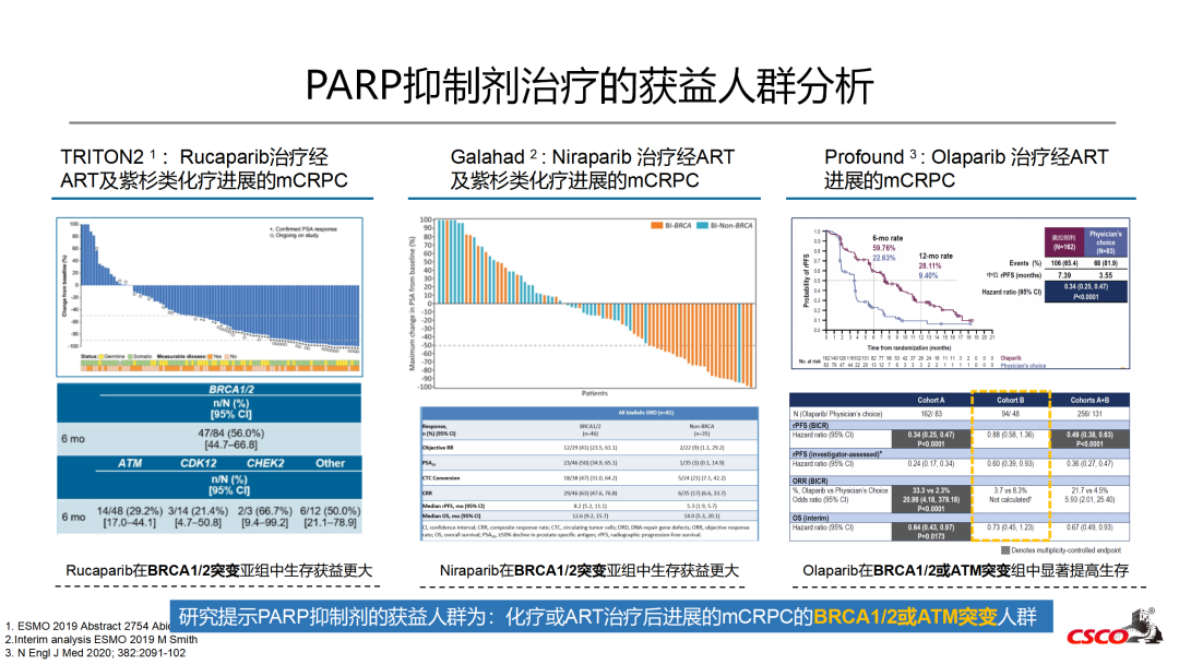PARP抑制剂也显示了对mCRPC患者的良好疗效,TRITON2研究、Galahad研究、Profound研究分别证实了卢卡帕利、尼拉帕利和奥拉帕利对ART或化疗治疗进展后mCRPC的疗效,尤其是BRCA突变或ATM突变亚组中PFS、OS、ORR均能取得更好获益。与此同时,BrightNess研究证实了在BRCA突变的乳腺癌患者人群中铂类和PARP抑制剂的疗效类似,那么类推之下,BRCA突变的前列腺癌对铂类是否同样有效仍未可知,期待更多头对头的对比研究予以证实。