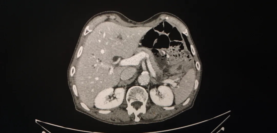 腹盆腔CT:胃内大量内容物,胃窦部壁明显增厚,肝实质内致密影,少量盆腔积液。